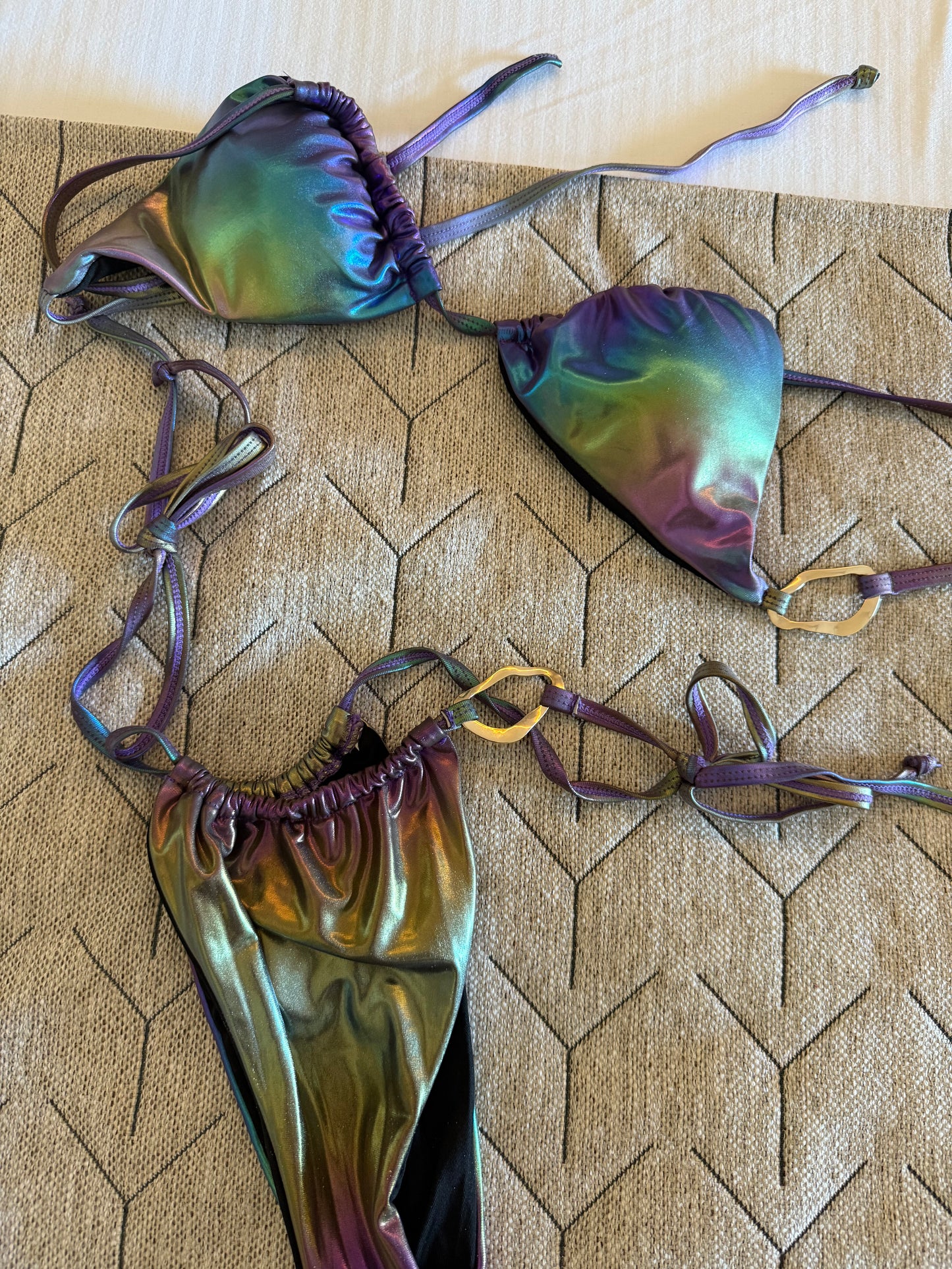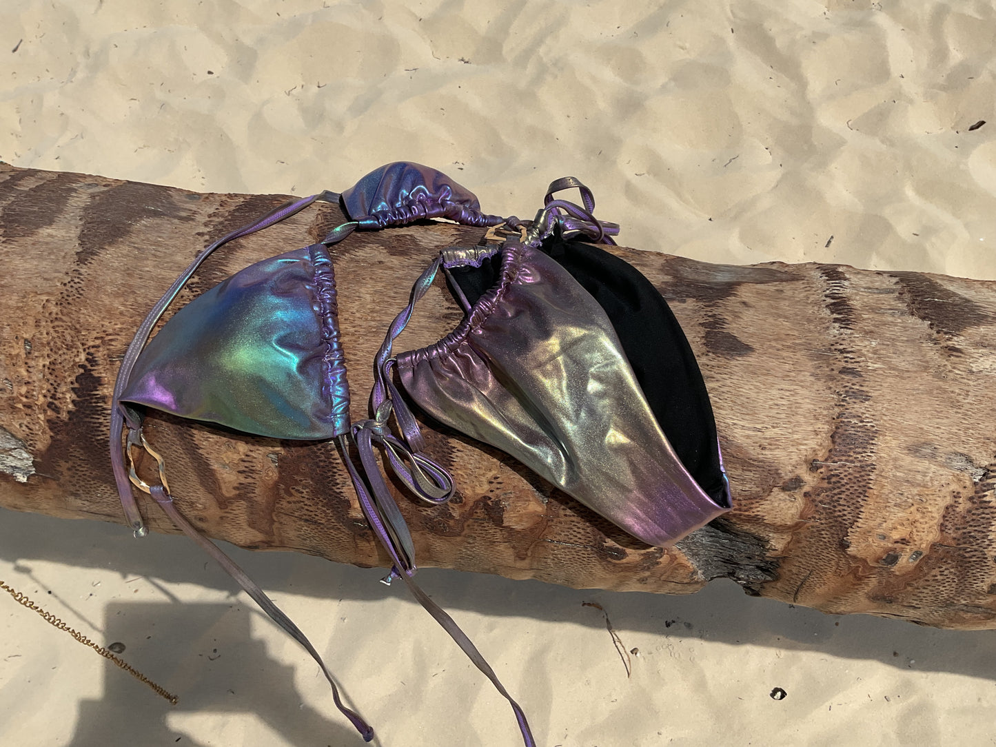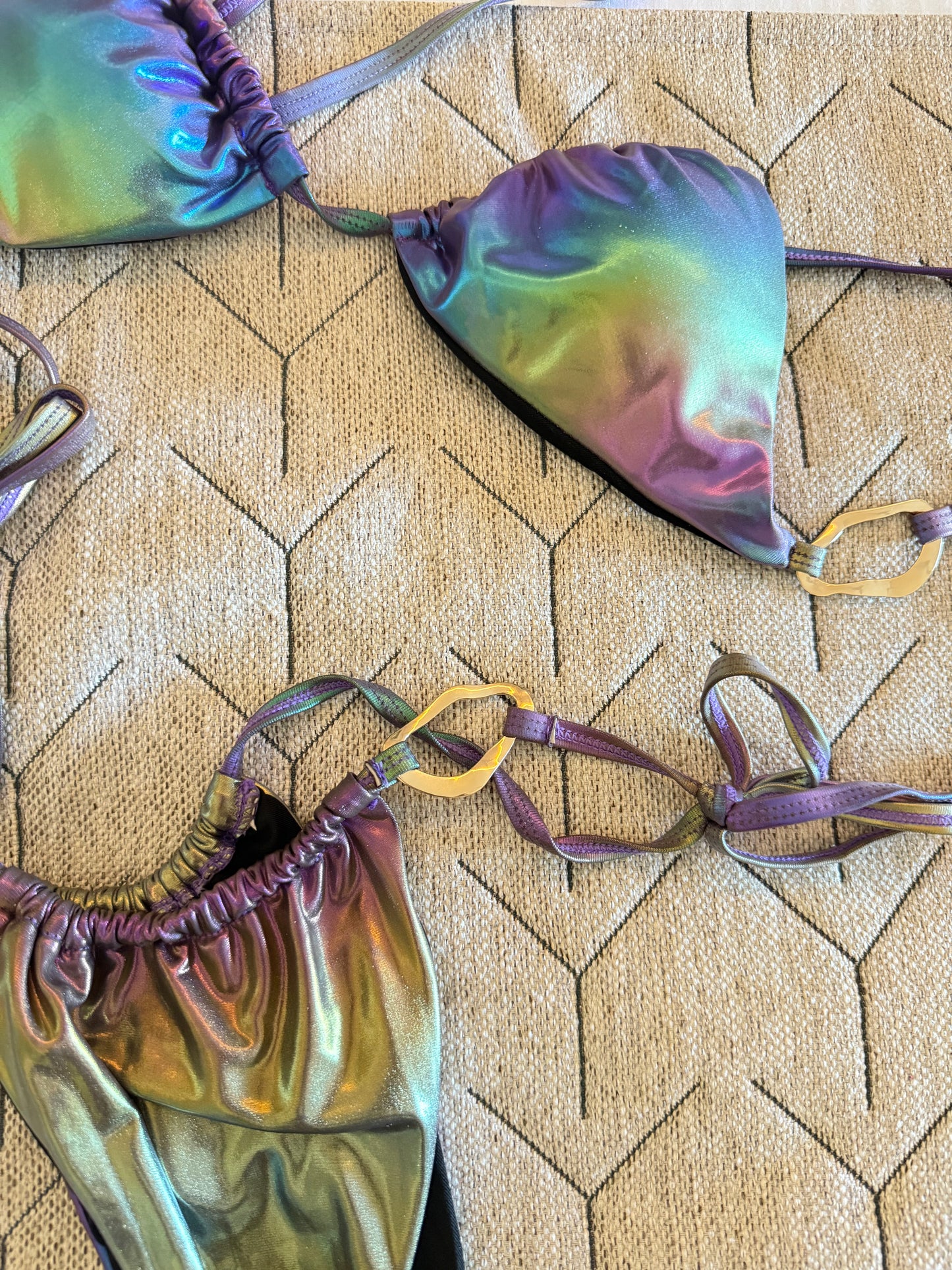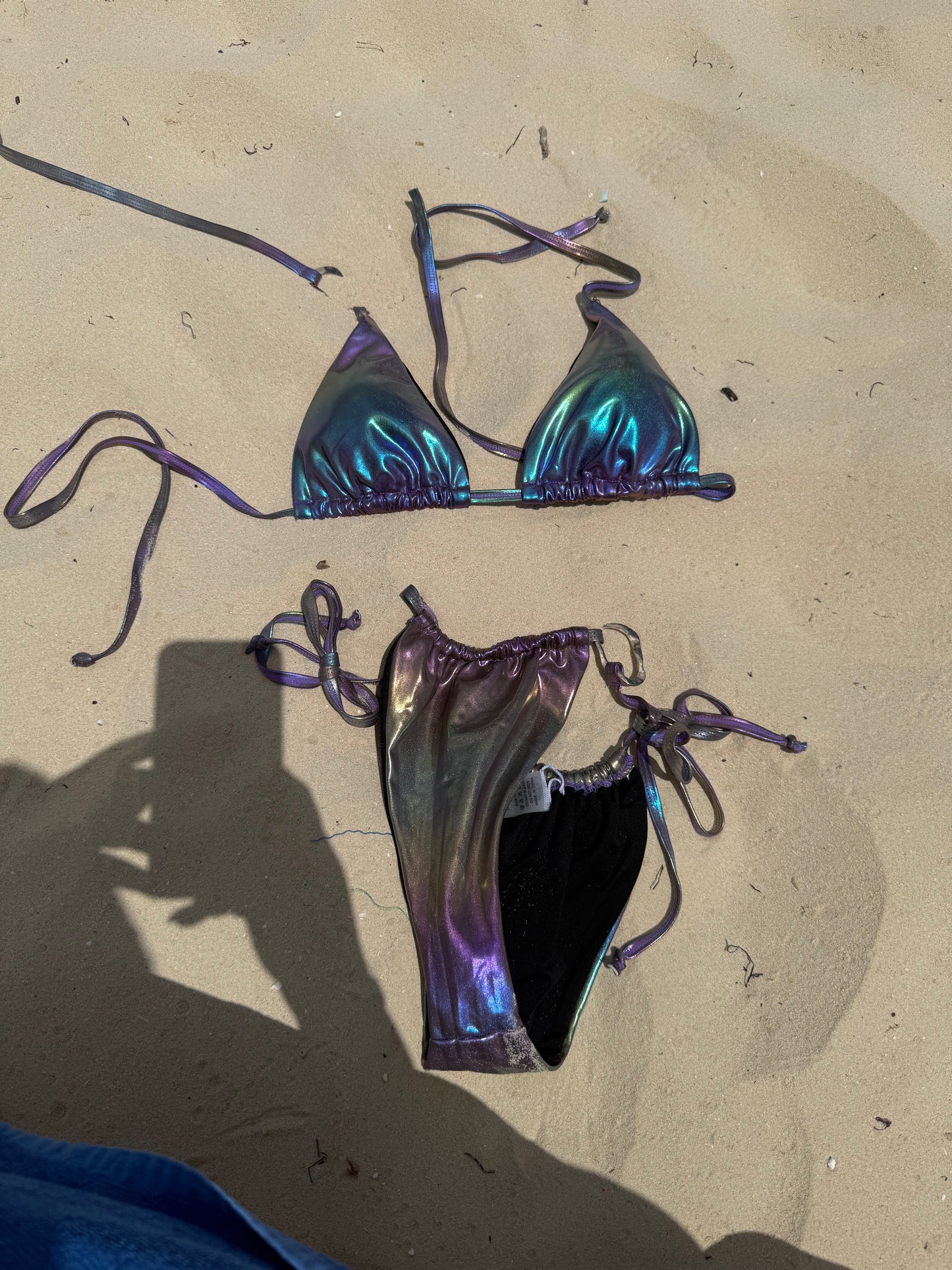 - Unleash your inner beach goddess with this stunning two piece thong kini. The iridescent fabric and gold accent pieces will make you feel like a true mermaid while soaking up the sun. You won't be able to resist the irresistible charm of this bikini!